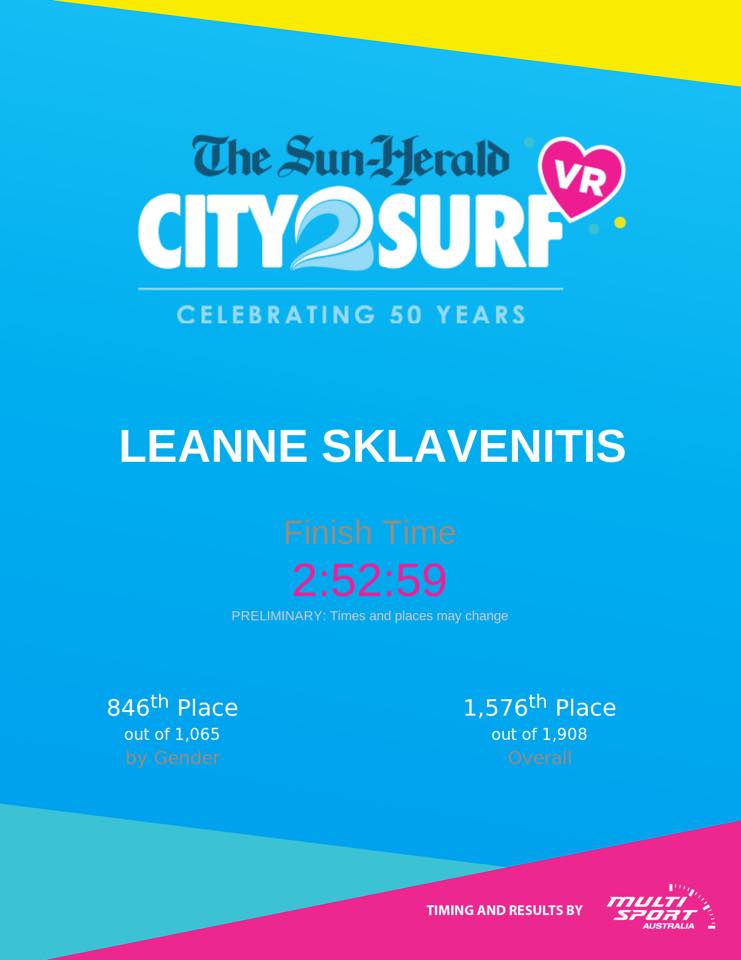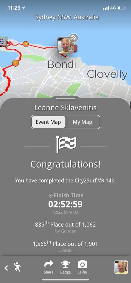 Well we did it! The City To Surf 14k virtual fun run with an army of supporters they pushed me all the way. I’m so grateful for everyone’s help including my other virtual runners in Melbourne and Sydney. I managed to walk the end bit with Steve and Maree by my side so happy. Bring on next year. Love you all x