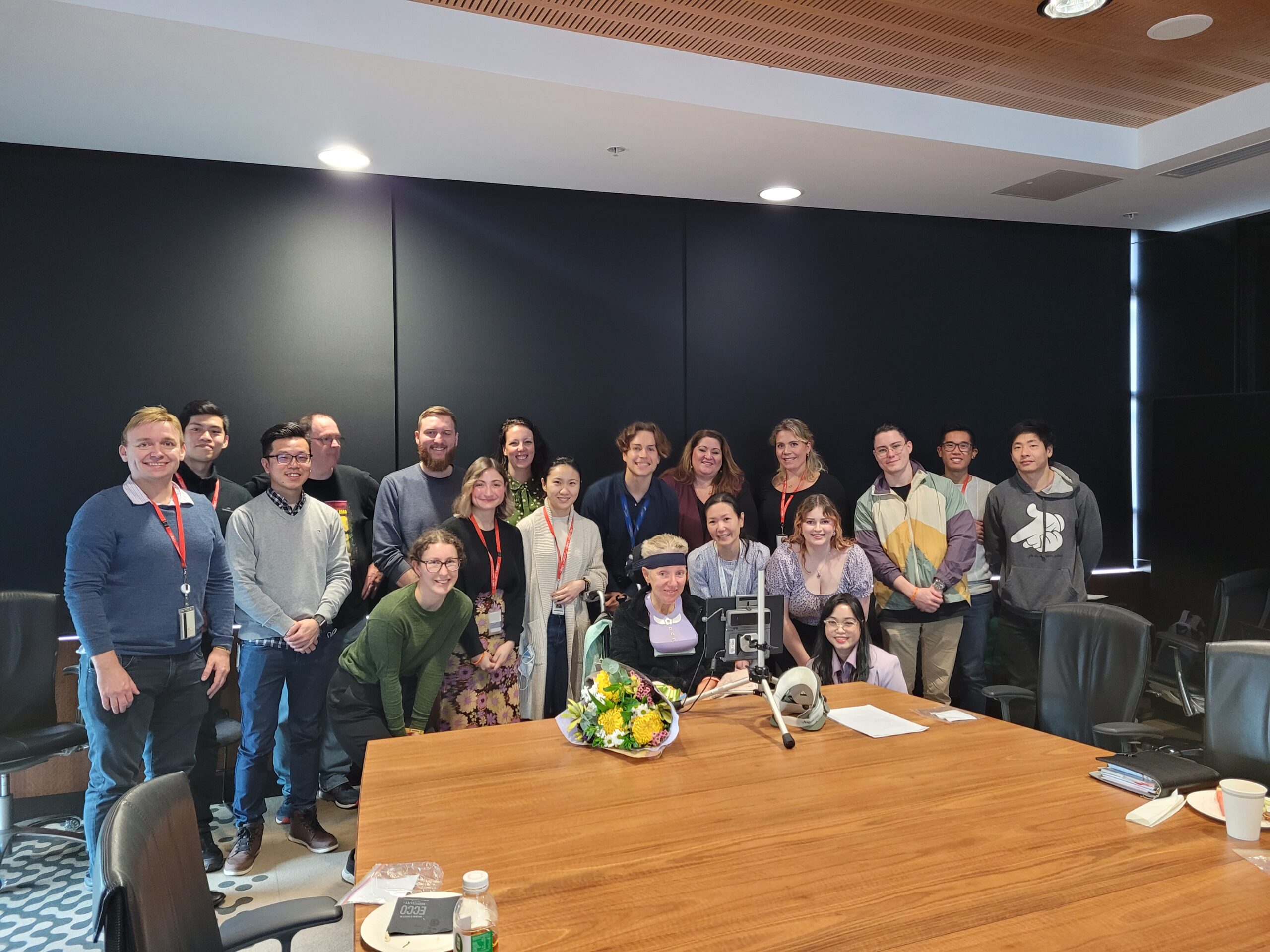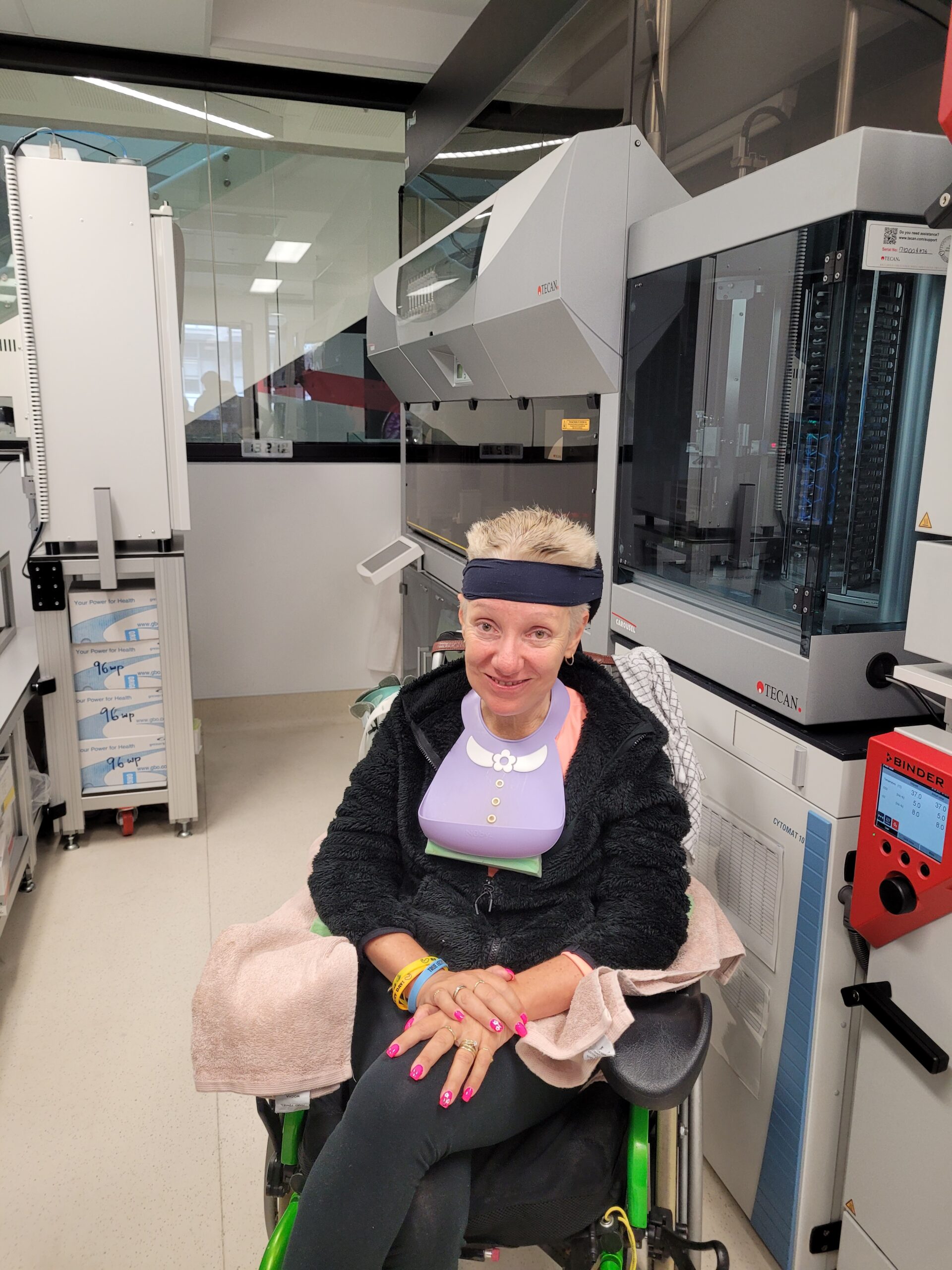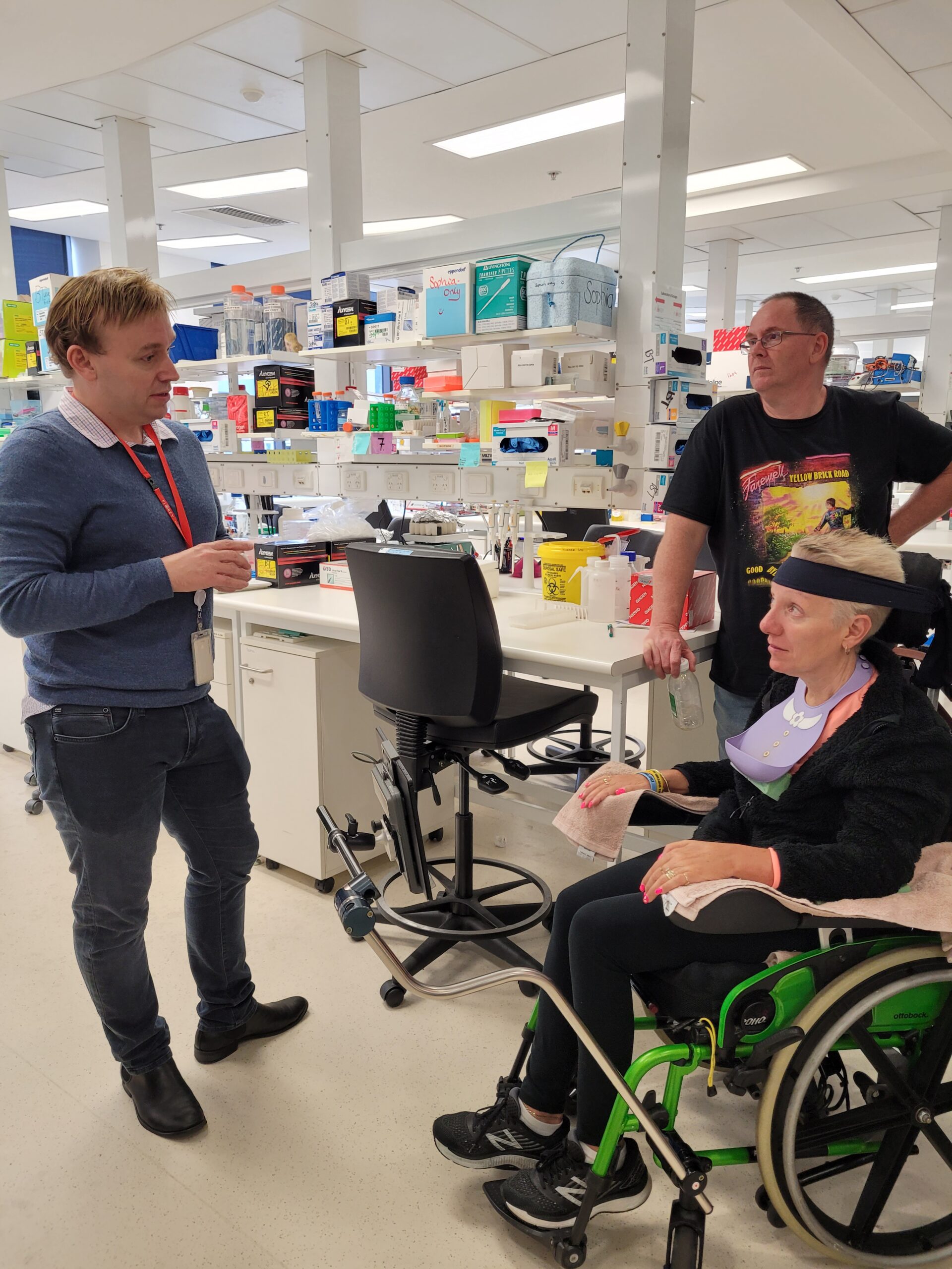 But, back to my time in the Lab! It was great to hear about their work first hand and give them a glimpse into my daily life with MND. We then had the opportunity to take a tour of the facilities. The Florey Institute is the fifth largest brain research group in the world, and fittingly the building itself is shaped like a brain! As you’d expect, the lab facilities are world class. There is an entire room designated especially for MND research thanks to the amazing support and funding by FightMND. We saw mouse brains and spines which are used for research purposes and there was one machine alone which cost 7 million dollars! It can automatically test five thousand different medicines to see if a cure can be found. To do this by hand would have taken years.