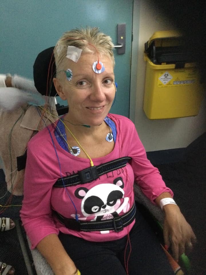 It wasn’t too much fun. I normally go to bed by nine. They finally hooked me up. Photo shows me with 22 wires connected all over body just before my amazing husband threw me into bed. They then put full oxygen mask over mouth and nose.